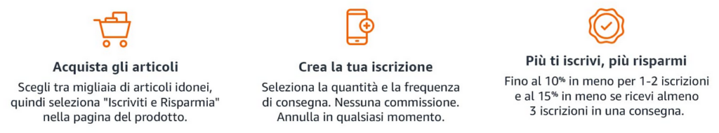 Il programma “Iscriviti e risparmia” di Amazon è una funzionalità pensata per chi acquista regolarmente prodotti di uso quotidiano e vuole risparmiare tempo e denaro. Con questo servizio puoi programmare consegne automatiche a intervalli regolari e beneficiare di sconti fino al 15% sul prezzo di listino.