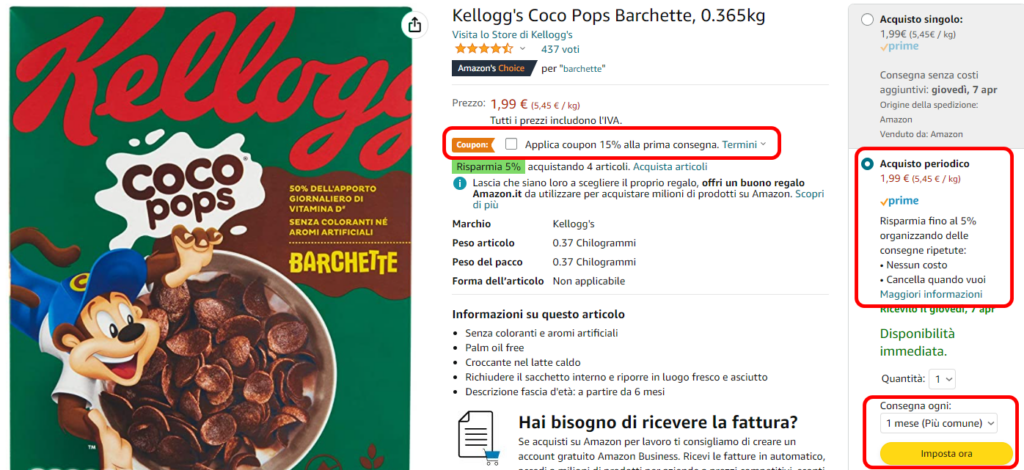 In questo esempio vediamo che possiamo usufruire di un Coupon 15% immediato al primo acquisto. Nella parte destra, possiamo selezionare l’acquisto periodico e scegliere la quantità e la frequenza con cui vogliamo ricevere i nostri cereali comodamente a casa (da 2 settimane fino a 6 mesi).