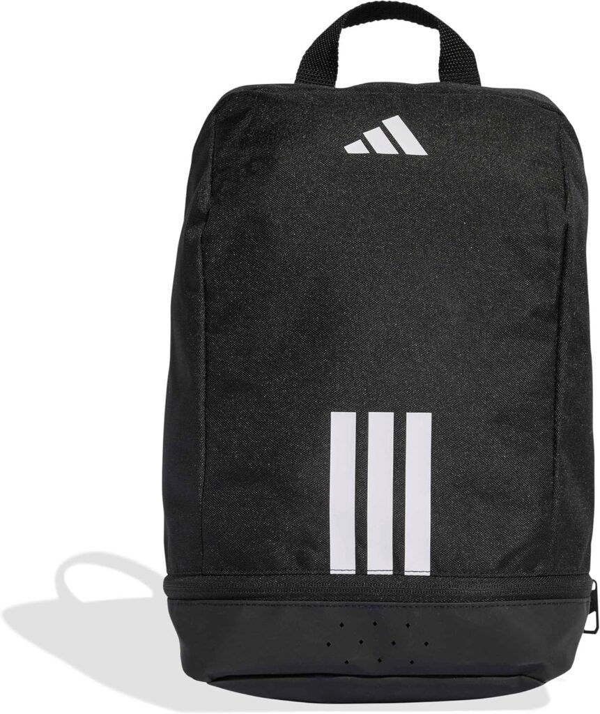 Borsa portascarpe unisex adidas Tiro realizzata in poliestere resistente, scomparto principale con zip, pannello laterale in mesh per ventilazione e maniglia per il trasporto. Design compatto, logo e 3-Stripes, ideale per trasportare scarpe sportive.